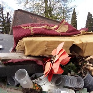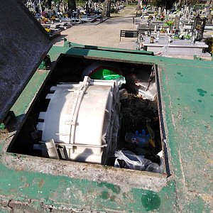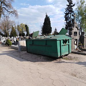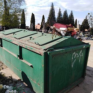 Śmietnik (kontener) na cmentarzu służy wyłącznie do zbierania śmieci takich jak: wypalone znicze, uschnięte kwiaty czy wiązanki itp. Dowożenie i wrzucanie do kontenerów innych przedmiotów nie pochodzących z cmentarza świadczy o braku szacunku dla miejsca pamięci zmarłych.