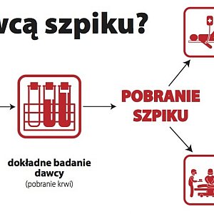 4. Dawca przechodzi dokładne badania, po których następuje pobranie. Od 80 proc. dawców szpik pobiera się z krwi obwodowej. Zabieg nie wymaga hospitalizacji ani znieczulenia. Trwa około 5 godzin. W niektórych przypadkach szpik trzeba pobrać z talerza kości biodrowej. Zabieg wykonuje się wtedy w narkozie. Szpik pobierany jest przez wkłucie, które lekarze wykonują w dołek nad pośladkami. Pobranie nie ma nic wspólnego z wkłuciem w kręgosłup.