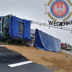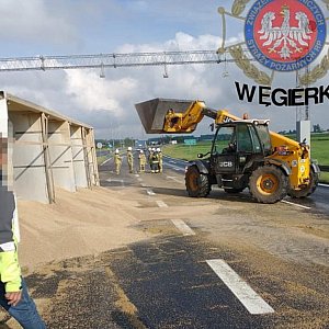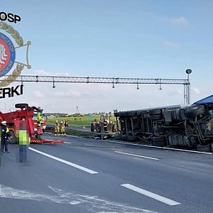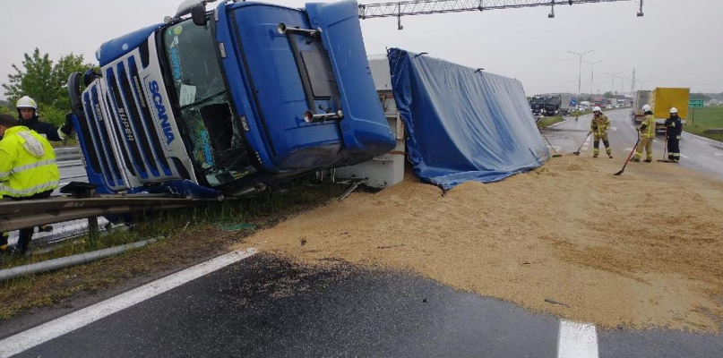 Z informacji przekazanych nam przez zarządcę drogi wynika, że na drodze doszło do zderzenia dwóch pojazdów: samochodu ciężarowego z samochodem osobowym. Pierwszy pojazd uderzył w barierki i przewrócił się na bok (na zdjęciu).