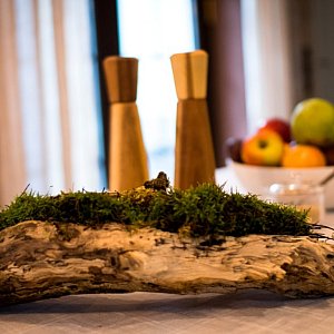We wnętrzu królują kolory ziemi i ozdoby z naturalnych materiałów. W holu ściana z kawałków drewna odzyskanych z ponadstuletnich stodół z całej Polski. Karnisze i lampy z konarów brzóz.