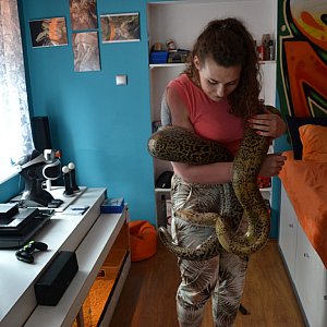 – Właściwie mam tylko łóżko, konsolę i jakieś rzeczy osobiste. Nic więcej się nie mieści – śmieje się właściciel. – W tej chwili mam 11 węży: 5 boa dusicieli, pytona tygrysiego, pytona zielonego i 4 pytony królewskie – wymienia.