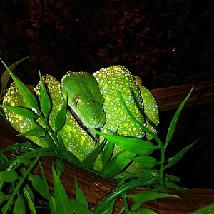 Perełką domowej hodowli jest pyton zielony. Bardzo wymagający, ale za to pięknie ubarwiony. – Pytony zielone świetnie zmieniają kolor w czasie dorastania. Najpierw są żółte, później intensywnie zielone, a samice w ciąży bywają niebieskie. To wąż, który musi mieć dużą wilgotność, na poziomie 70-90 proc. w dzień, a w nocy około 90 proc. Przy takiej znacznej wilgotności musi mieć duży nawiew oraz dodatkowo generator pary mgłowej – opowiada Wojtek.