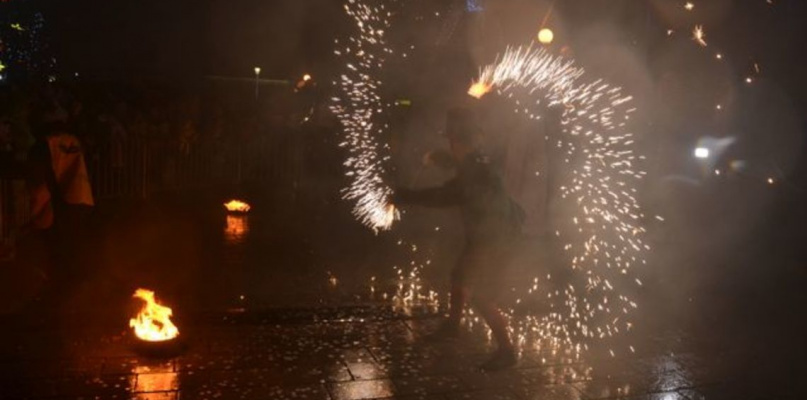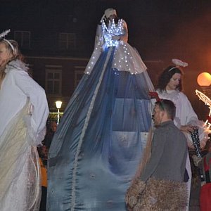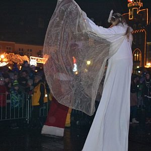 Przedstawienie mikołajkowe, poczynając od korowodu na ul. Warszawskiej, poprowadzili szczudlarze z ulicznego teatru „Z głową w chmurach”.