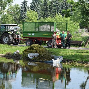 Prace zlecił Urząd Miasta i Gminy we Wrześni, a wykonuje je firma PPPU-H „Leśnik” z Chrustowa. Przyjezdni specjaliści oczyszczają bezodpływowy staw z glonów, śmieci i gałęzi, a także wsypują do niego ściśle określone ilości wapna.