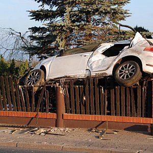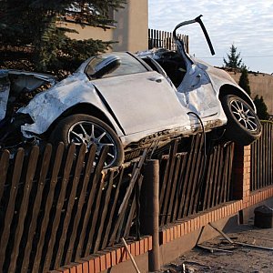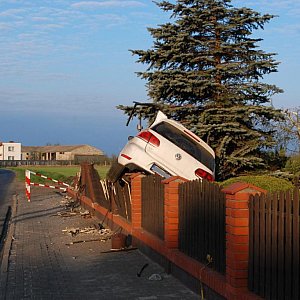 Uwaga na białe auto marki VW unoszące się nad chodnikami i innymi obiektami . Ten płoty był wybudowany niezgodnie z prawem budowlanym bo był zbyt wysoki. Jakby był niższy to kierowca by spokojnie przeleciał nad ogrodzeniem i poleciał gdzie indziej... a ta zepsuł swój piękny samochód przez ten płot.