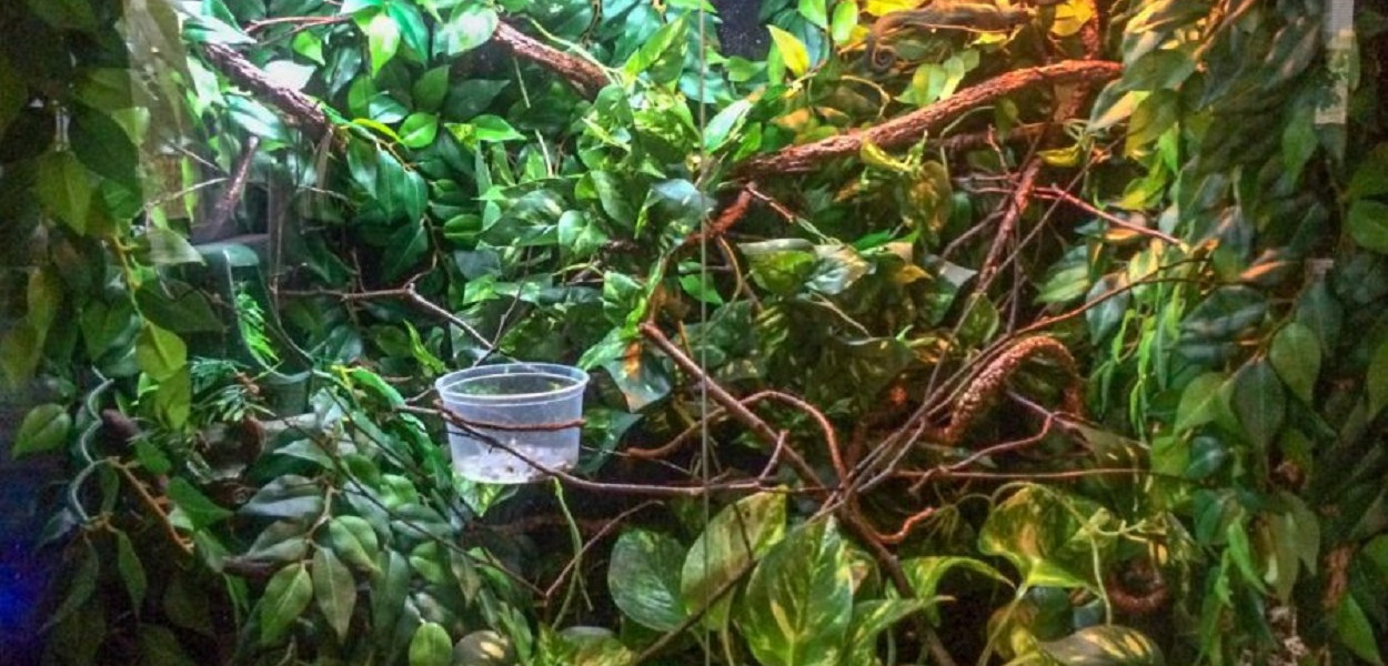 Przeciwieństwem terrarium pustynnego jest terrarium tropikalne. Zazwyczaj jest pionowe, ale nie jest to wymóg. Kluczem jest utrzymanie w miarę stałej temperatury. W nocy może spaść o kilka stopni, ale ważne jest, aby kable grzewcze były podłączone do termostatu, aby pilnować temperatury w dzień i w nocy. W terrarium tropikalnym wilgotność względna musi być wysoka, co uzyskuje się poprzez regularne spryskiwanie letnią wodą. Tropikalne terrarium może być ozdobione kawałkami drewna, roślinami takimi jak bromelie lub roślinami pokojowymi, które nie wymagają zbyt wiele światła i oczywiście nie są trujące. Dno jest zazwyczaj wyłożone torfem, który w razie potrzeby można wymieszać z piaskiem. Nadają się również włókna kokosowe, zwane torfem kokosowym.