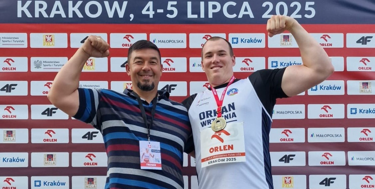 W piątek ostatnim naszym startującym zawodnikiem był Damian Rodziak (na zdjęciu z trenerem Pawlakiem). Miotacz Orkana w obecnym sezonie pchnął kulę na odległość 16,98 m, o 28 cm mniej niż w ubiegłym roku. Nie był faworytem tegorocznych mistrzostw, bo wyraźnie ustępował w tabelach Jakubowi Korejbie z Opola. W drugiej kolejce konkursu Damian poprawił swoją życiówkę na 17,28 m i w tym momencie wyprzedzał swojego najgroźniejszego konkurenta blisko o 1,5 metra. Rozpoczynający trzecią kolejkę Korejba wyprzedził naszego reprezentanta o 16 cm. W piątej serii rzutów doczekaliśmy się riposty i to jakiej! Rodziak pchnął kulę na 18.00, po raz drugi poprawił tego dnia życiówkę i odebrał rywalowi wszelkie nadzieje. Złoto przypadło Orkanowi.