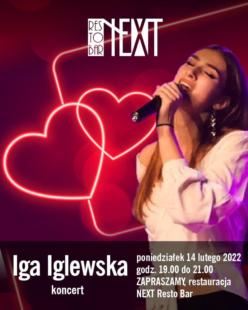 Kto często bywa w lokalu, być może miał już okazję usłyszeć utalentowaną piosenkarkę. Tym razem Iga Iglewska zaprezentuje się w romantycznej walentynkowej odsłonie. Koncertu będzie można wysłuchać w poniedziałek, 14 lutego w godz. 19.00-21.00.