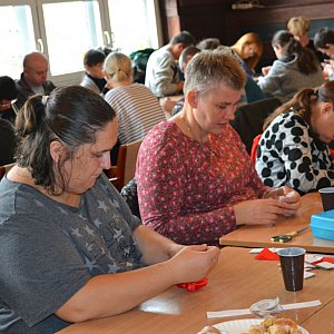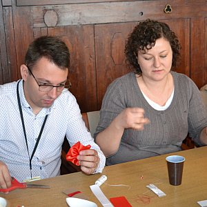 Uczestnicy przy herbacie i ciastkach tworzyli narodowe emblematy.