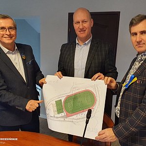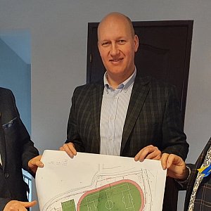 Tadeusz Tomaszewski rozmawiał z Hubertem Gruszczyńskim, burmistrzem Miłosławia na temat rozbudowy obiektów sportowych na terenie gminy Miłosław.