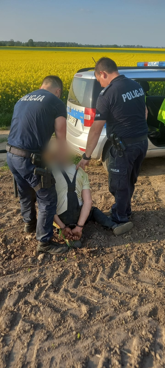 Gołanieccy policjanci otrzymali wsparcie funkcjonariuszy z Damasławka i Wągrowca. Rozpoczęto przeczesywanie pola. Mężczyzna, który położył się w polu zauważył zmierzających ku niemu policjantów. Rozpoczął dalszą ucieczkę w gęstwinie, jednak bezskutecznie próbował wyrwać się funkcjonariuszom i stawiał daremny opór. Został obezwładniony, na jego rękach zatrzasnęły się kajdanki, policjanci wyprowadzili go z gęstej roślinności.