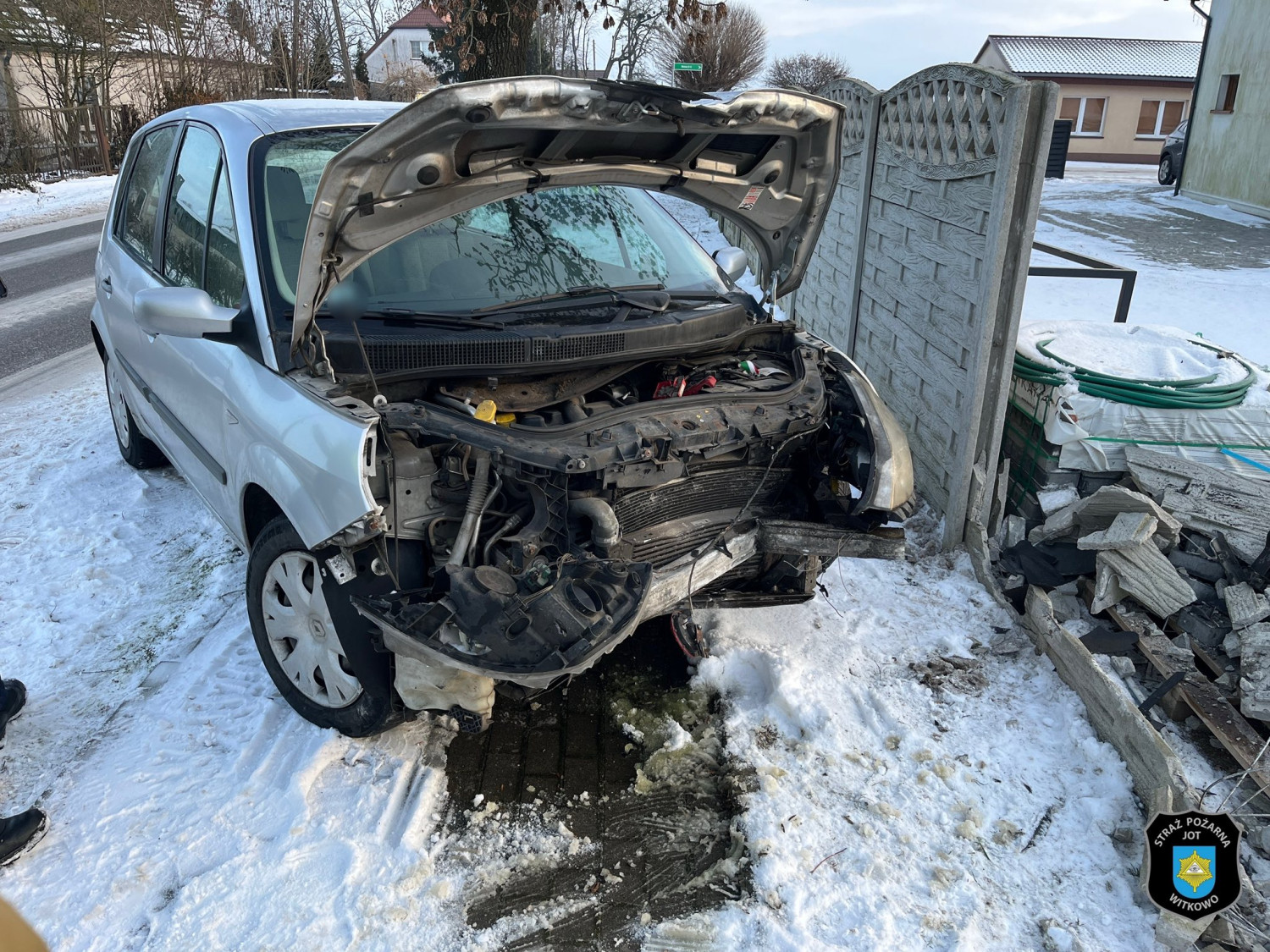 Po dotarciu na miejsce zdarzenia zastali pojazd osobowy Renault w pozycji na kołach po uderzeniu czołowym w płot. Działania ochotników polegały na zabezpieczeniu miejsca zdarzenia oraz odłączeniu akumulatora w pojeździe.