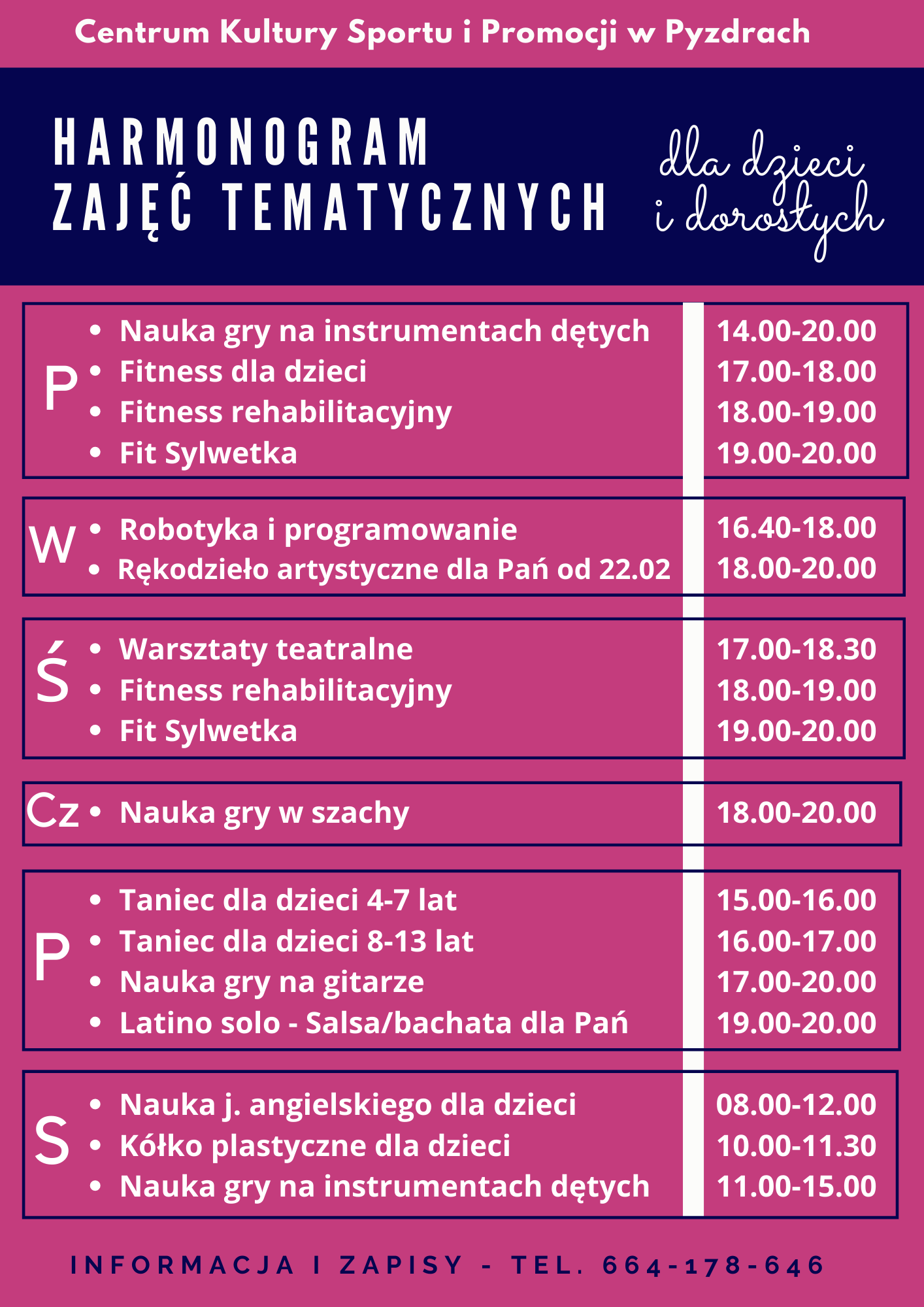 - Przypominamy, że cały czas odbywa się fitness dla dzieci, fitness rehabilitacyjny, fit sylwetka oraz zajęcia taneczne dla dzieci i salsa dla pań. Stały grafik mają też warsztaty teatralne - mówi Sylwia Kaźmierska, dyrektor centrum.