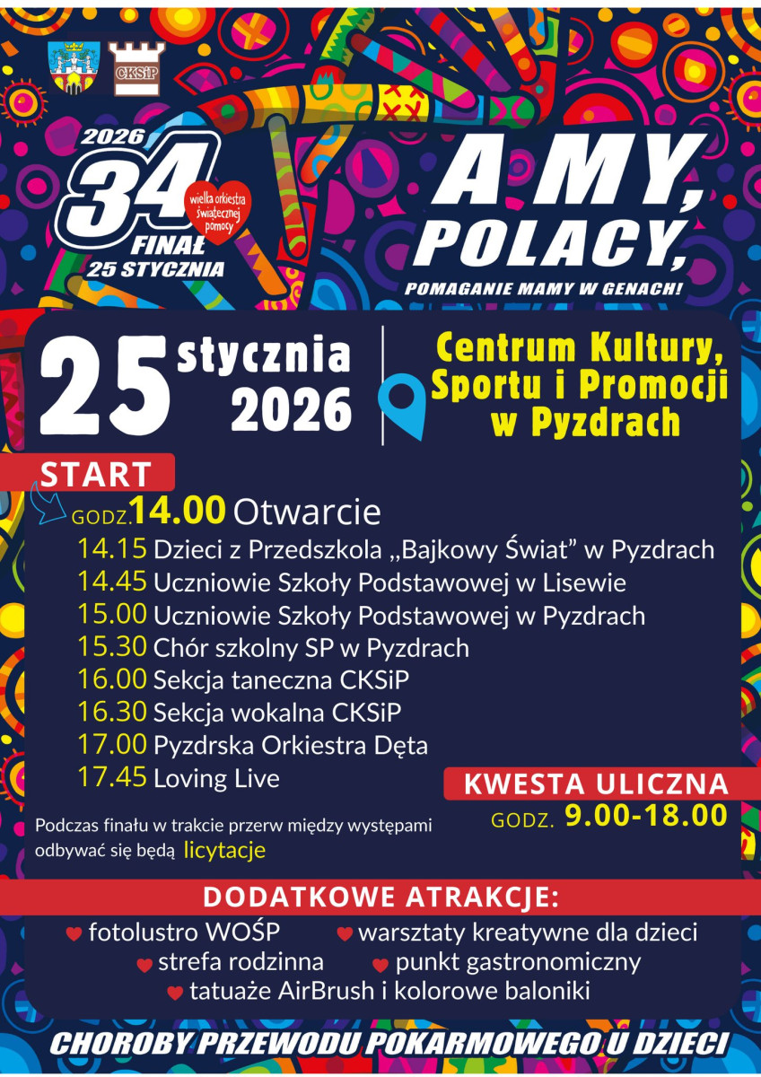 CKSiP zostanie podzielone na dwie części. Sala kina będzie miejscem występów i licytacji, natomiast na sali głównej będą atrakcje dodatkowe: punkt gastronomiczny, warsztaty artystyczne i zajęcia dla najmłodszych. Na scenie wystąpią dzieci z przedszkola Bajkowy Świat, uczniowie szkół podstawowych, sekcja taneczna i wokalna działająca przy CKSiP, orkiestra dęta i zespół Loving Life. Miłym przerywnikiem będą licytacje. Pod młotek pójdą m.in. zdjęcia Karola Budzińskiego, koszulki z autografem Krzysztofa Skiby i WOŚP-owe gadżety.