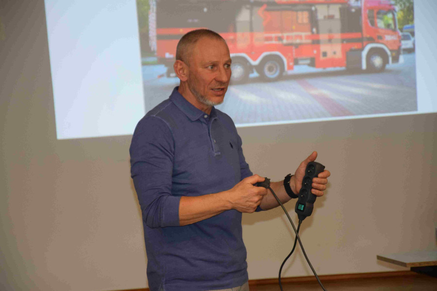 Marek Piekutowski, to były oficer Państwowej Straży Pożarnej opowiadał o tym jak działa system państwa w czasie zagrożenia klęskami żywiołowymi i co będzie się działo podczas zagrożenia militarnego. Strażak udzielił kilku praktycznych rad, jak radzić sobie z małymi pożarami w domach i mieszkaniach, a przede wszystkim jak się przed tym zabezpieczyć. Wyjaśniał także problem sygnalizacji alarmowej dla ludności.