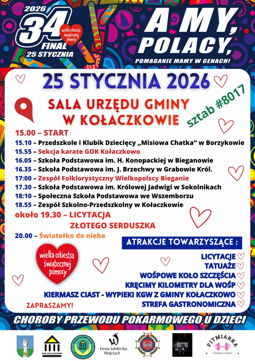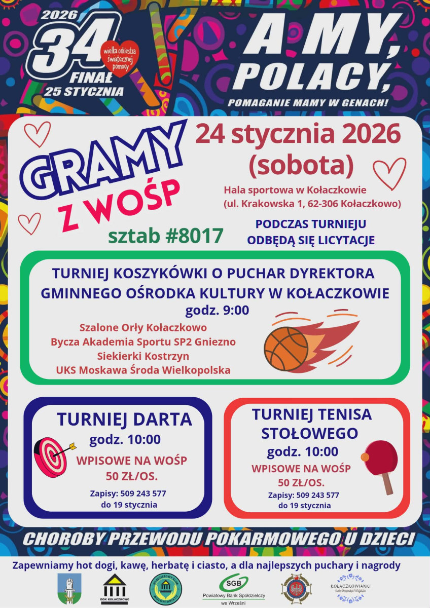W tym roku 34. Finał WOŚP w gminie Kołaczkowo będzie trwał przez dwa dni. W sobotę 24 stycznia w hali sportowej w Kołaczkowie pod patronatem Orkiestry odbędą się turnieje: koszykówki (9.00), darta i tenisa stołowego (10.00). – Zainteresowanie jest bardzo duże, na darta zgłosiło się ponad 30 osób, na tenis ponad 20 – wylicza dyrektor GOK-u.