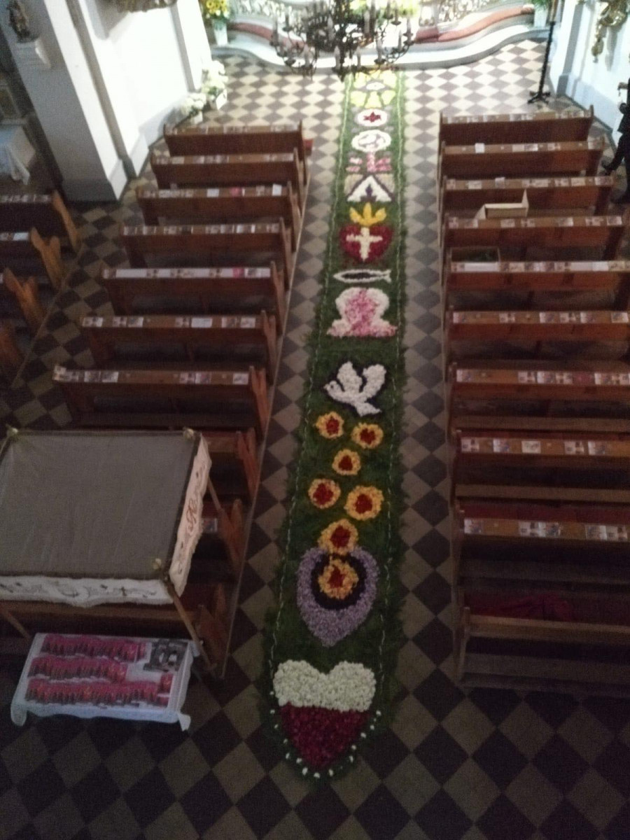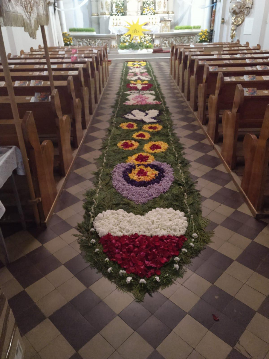 Kwiaty były zbierane jeszcze w tym tygodniu w sołectwach obejmujących nekielską parafię. Była to inicjatywa Marcina Olejniczaka. W układanie patriotyczno-religijnej kompozycji zaangażowała się grupa wolontariuszy. Wypełniła ona niemal całkowicie główne przejście w nawie głównej kościoła.