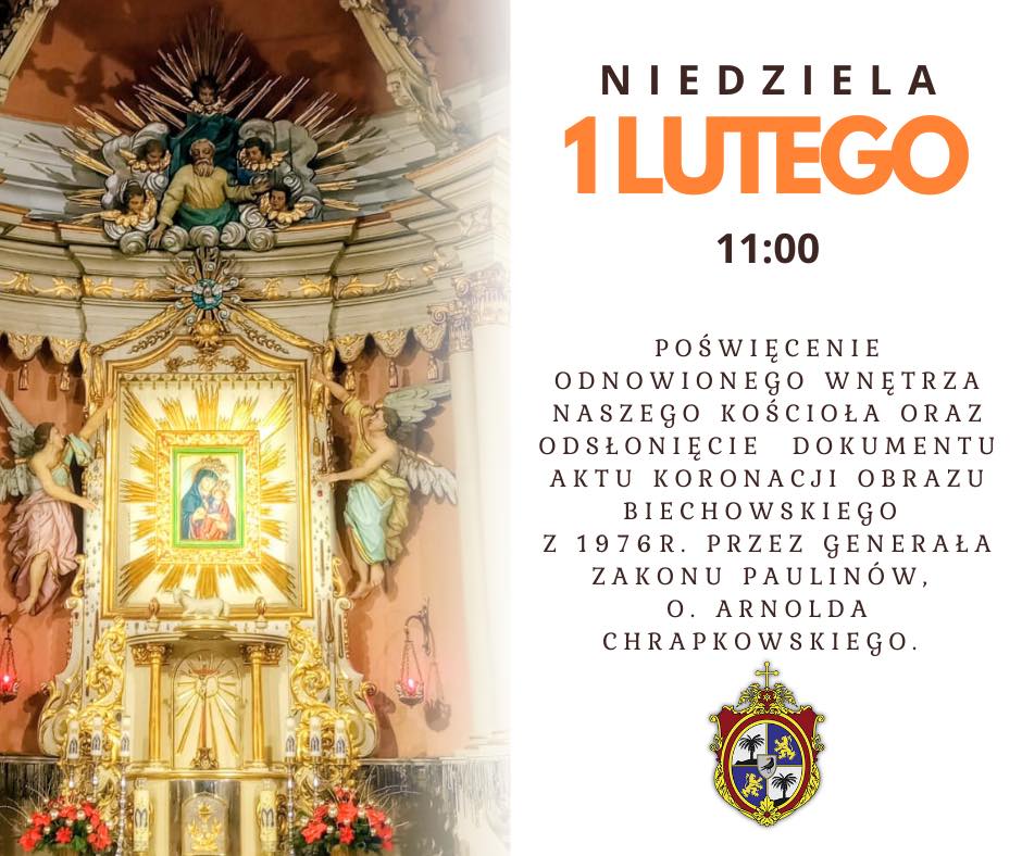 W niedzielę 1 lutego sanktuarium w Biechowie odwiedzi Przełożony Generalny Zakonu Paulinów, ojciec generał Arnold Chrapkowski. Podczas mszy świętej o godzinie 11.00 dokona poświęcenia odnowionego wnętrza kościoła oraz odsłoni odnowiony dokument Aktu Koronacji Obrazu Biechowskiego z 1976 roku.