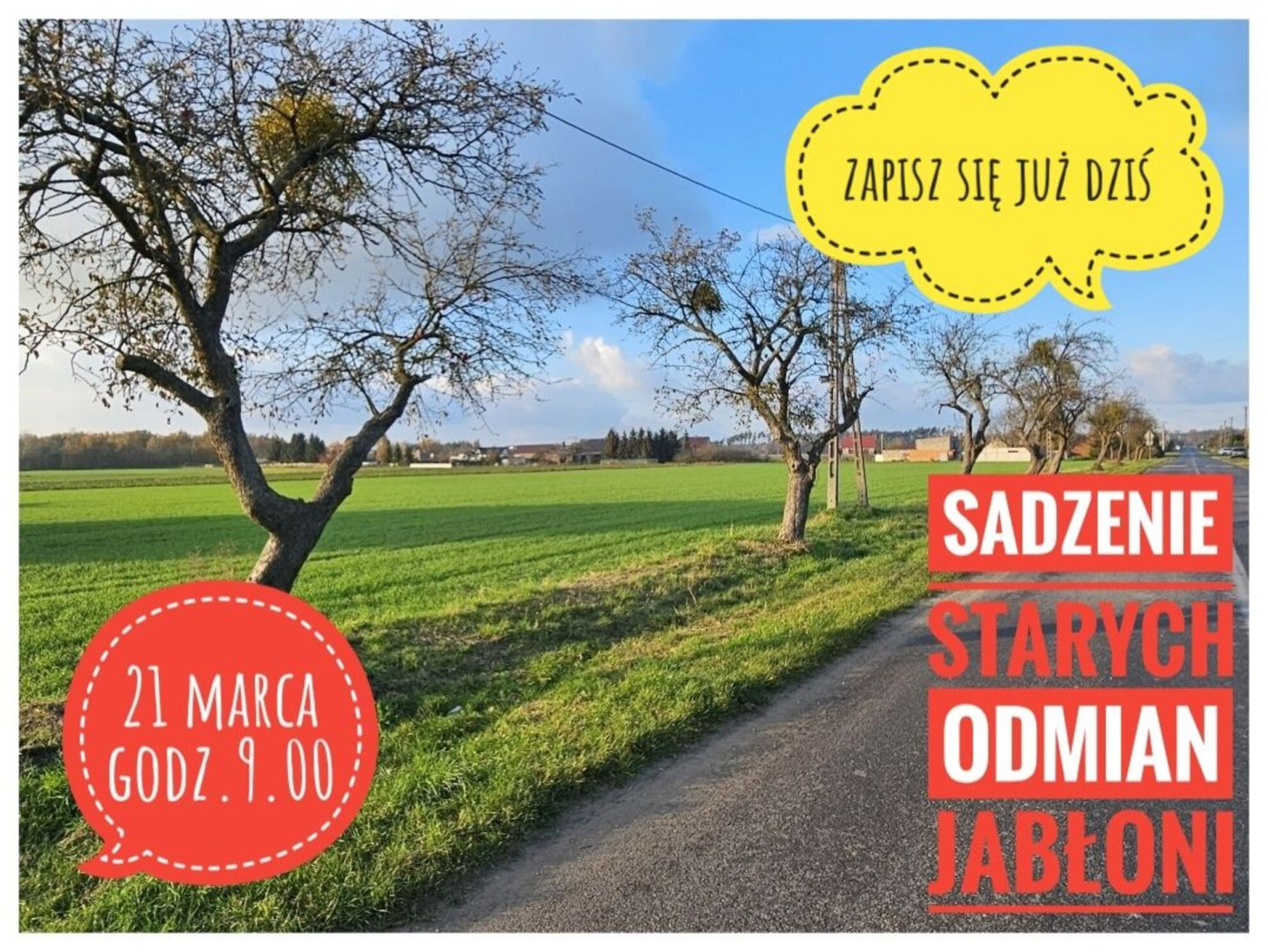 Sołtys Orzechowa Aleksander Warczygłowa wraz z Zespołem Parków Krajobrazowych Województwa Wielkopolskiego zaprasza wszystkich mieszkańców na wspólną akcję sadzenia starych odmian jabłoni przy ulicy Jabłoniowej.