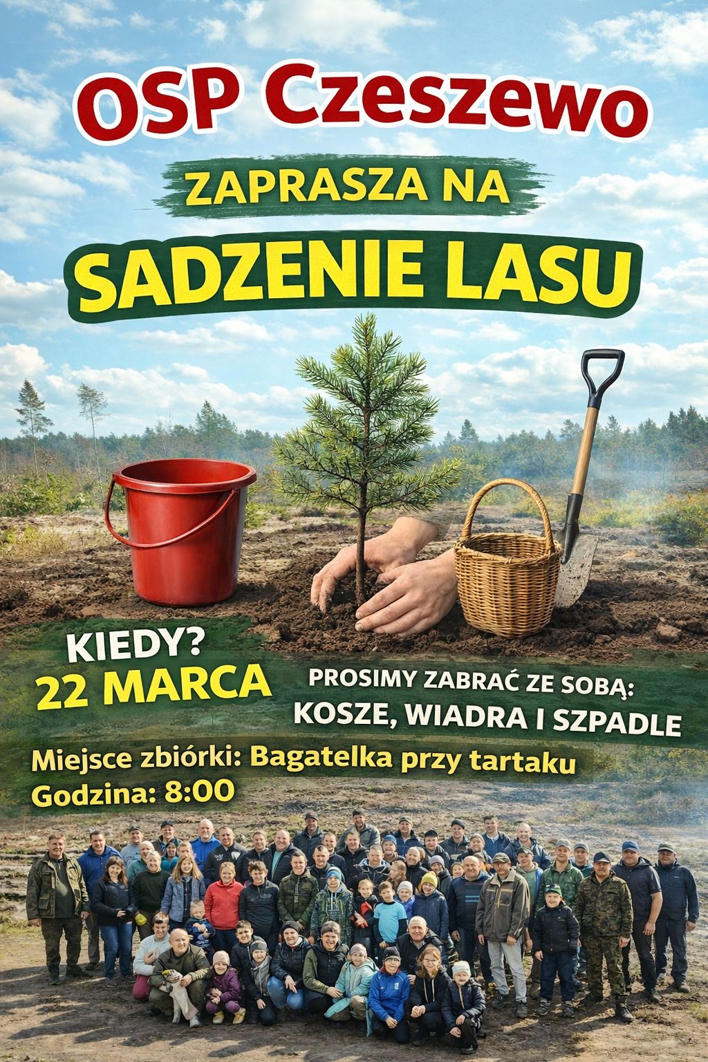 Ochotnicza Straż Pożarna w Czeszewie zaprasza wszystkich chętnych na sadzenie lasu, które rozpocznie się 22 marca o godz. 9.00. Uczestnicy są proszeni o zabranie szpadli, koszy lub wiader. Zbiórka przy tartaku w Bagatelce.