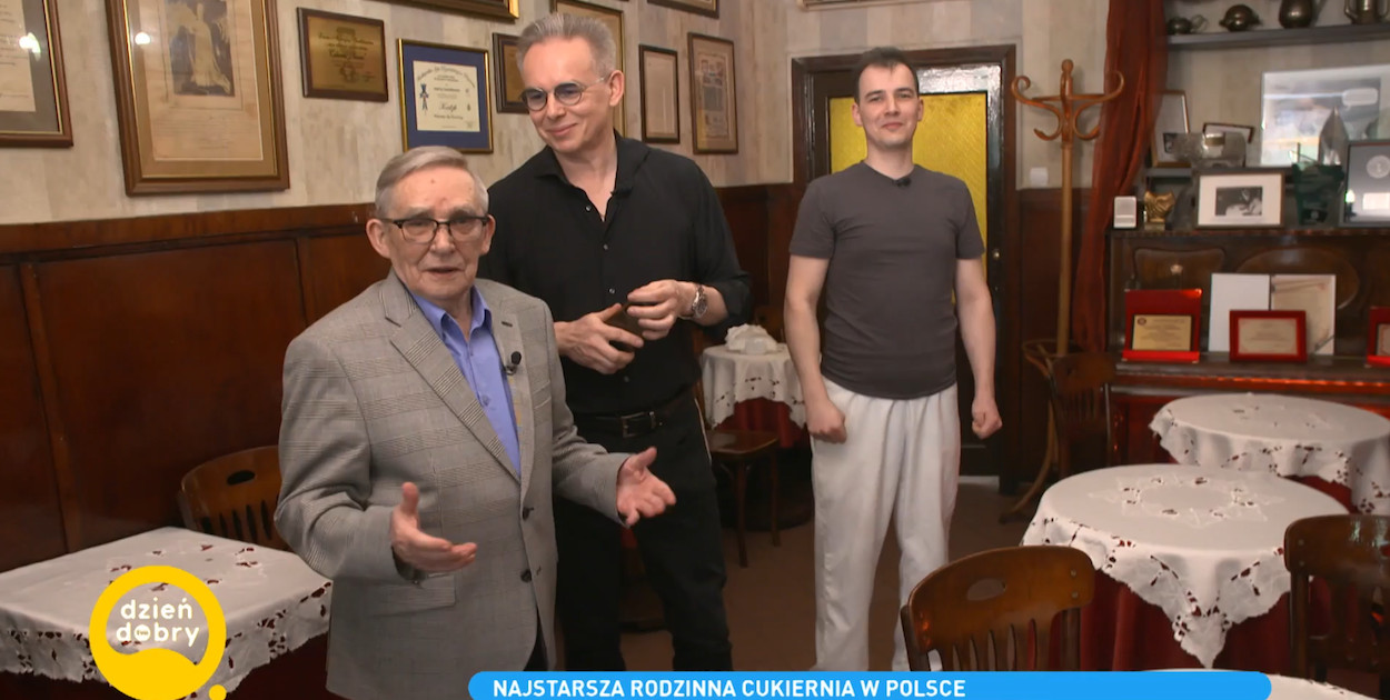 W poniedziałek 13 maja TVN w swoim porannym paśmie wyemitował bardzo sympatyczny materiał na temat wrzesińskiej cukierni z ul. Jan Pawła II. Wystąpili w nim przedstawiciele trzech ostatnich pokoleń właścicieli: Andrzej, Robert i Mateusz Smodlibowscy.