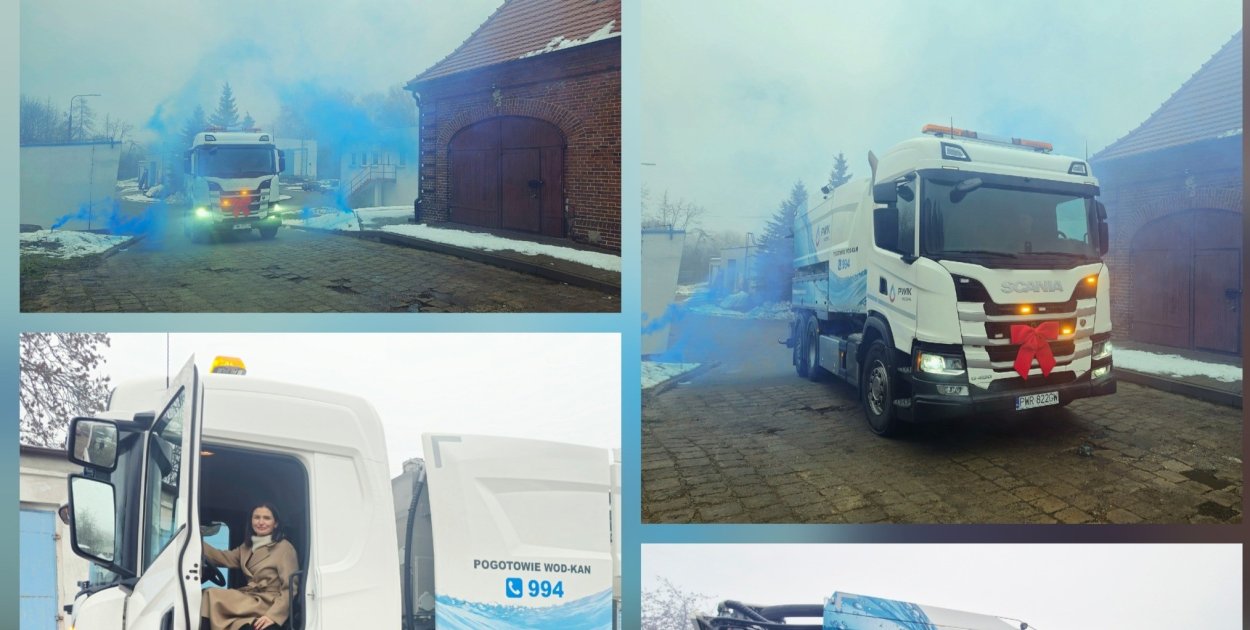 Zarząd spółki powitał nowy wóz kanalizacyjny w strażackim stylu. Wykonano sesję zdjęciową z błękitnymi racami i autem ozdobionym kokardą. W nowym wozie zapozowała też prezes Karolina Solecka.