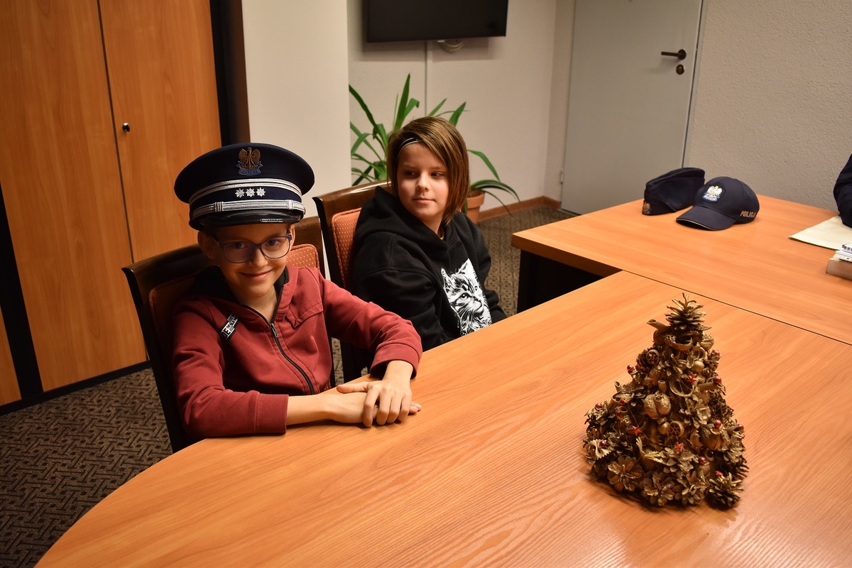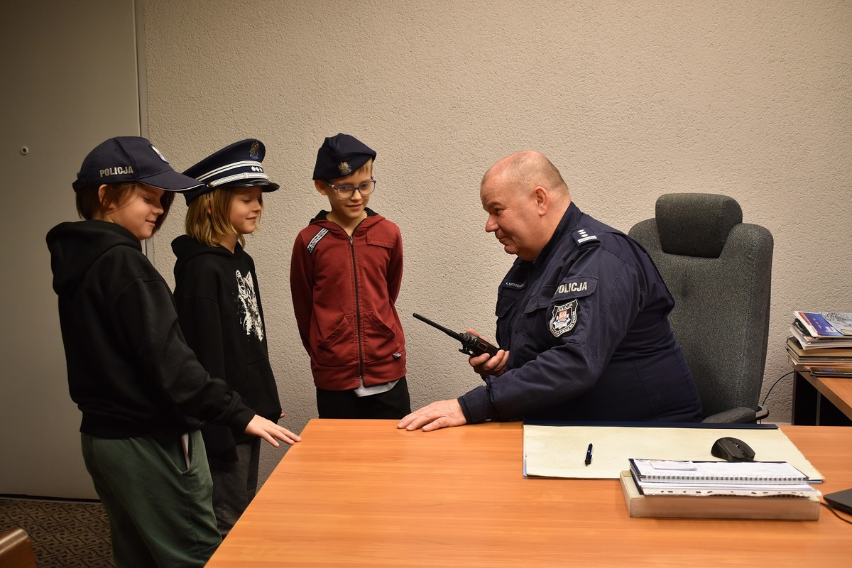 Nie zabrakło również rozmowy przez policyjną radiostację oraz kontaktu z dyżurnym stanowiska kierowania, co wzbudziło duże emocje i zainteresowanie.Podczas wizyty uczestnicy zwiedzili kolejne wydziały komendy, poznając specyfikę pracy policjantów pełniących służbę na różnych stanowiskach.