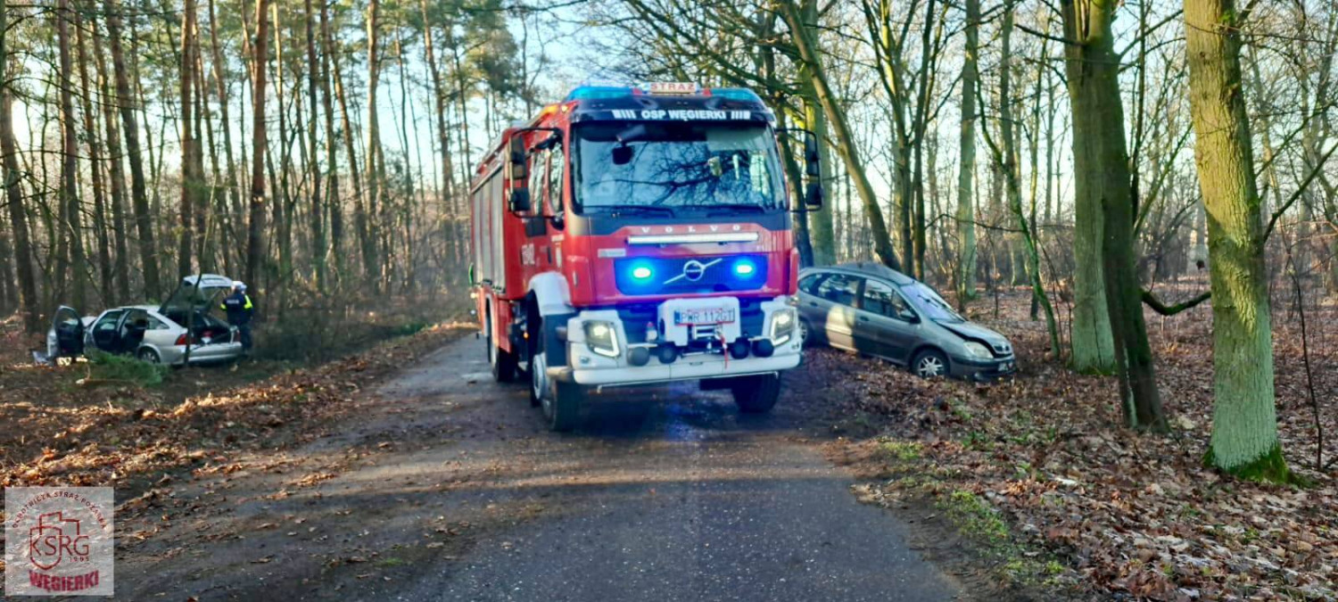 Na drodze doszło do zderzenia dwóch samochodów osobowych. Jeden z pojazdów wypadł z jezdni i uderzył w drzewo.