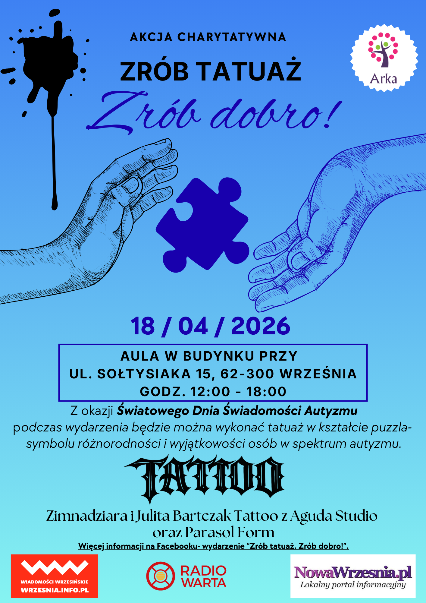 Akcja organizowana jest z okazji Światowy Dzień Świadomości Autyzmu przez NOREW Arka we współpracy z tatuażystami z Aguda Studio - Piercing & Tattoo Września oraz Parasol Form.
