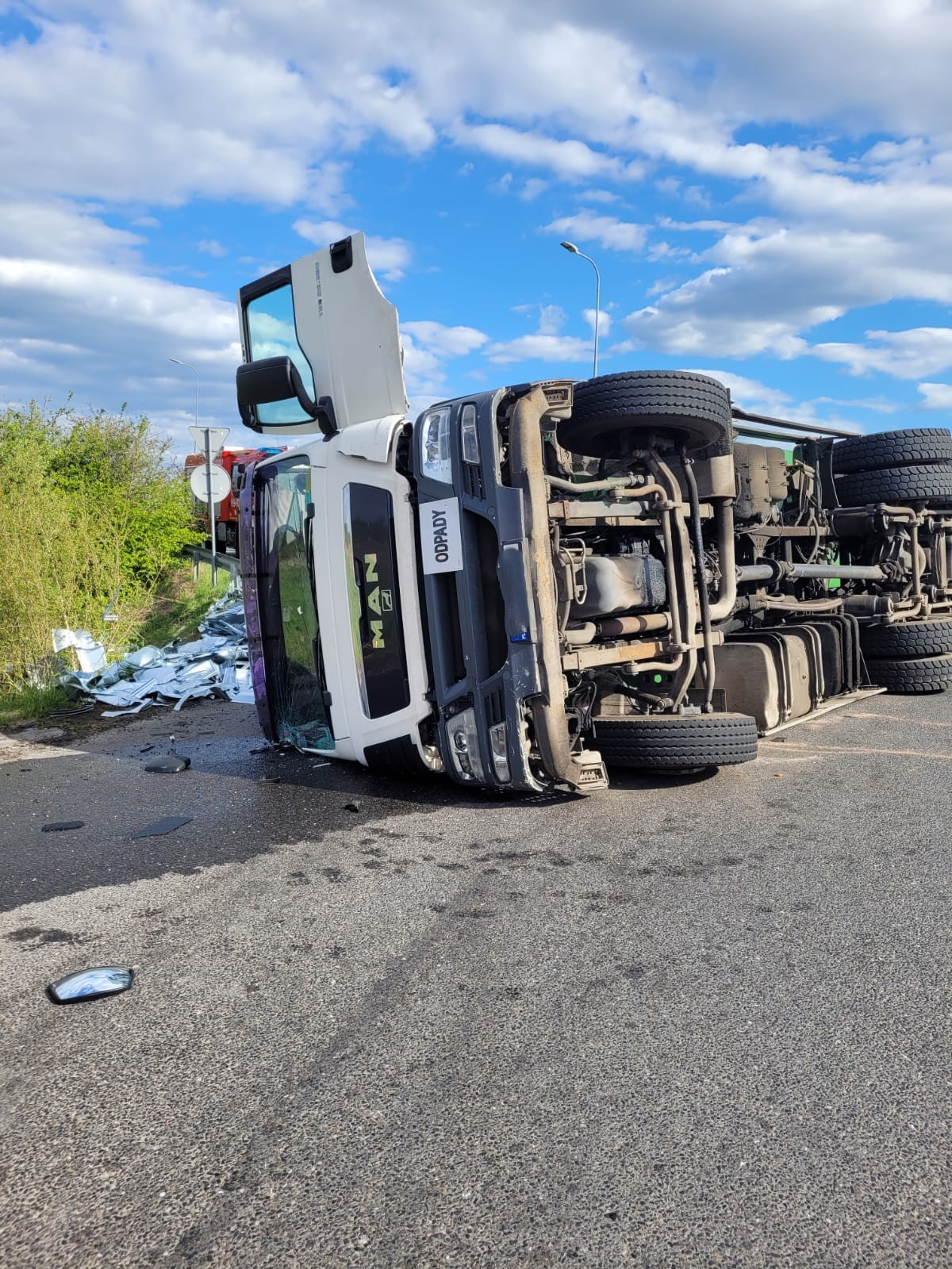 Po dojeździe służb okazało się, że pojazd przewrócił się na bok. W wyniku zdarzenia doszło do wycieku oleju napędowego ze zbiornika, a przewożony ładunek (elementy blaszane) został rozrzucony na jezdni.