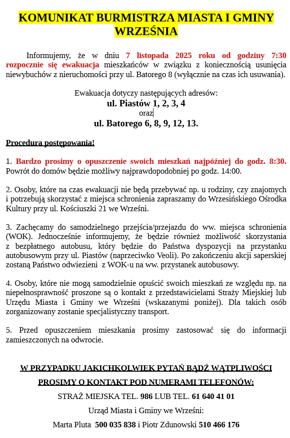 Chodzi tu dokładne o ul. Piastów 1, 2, 3 i 4 oraz ul. Batorego 6, 8, 9, 12 i 13. Mieszkańcy tych adresów muszą opuścić swoje domy najpóźniej do godz. 8.30.