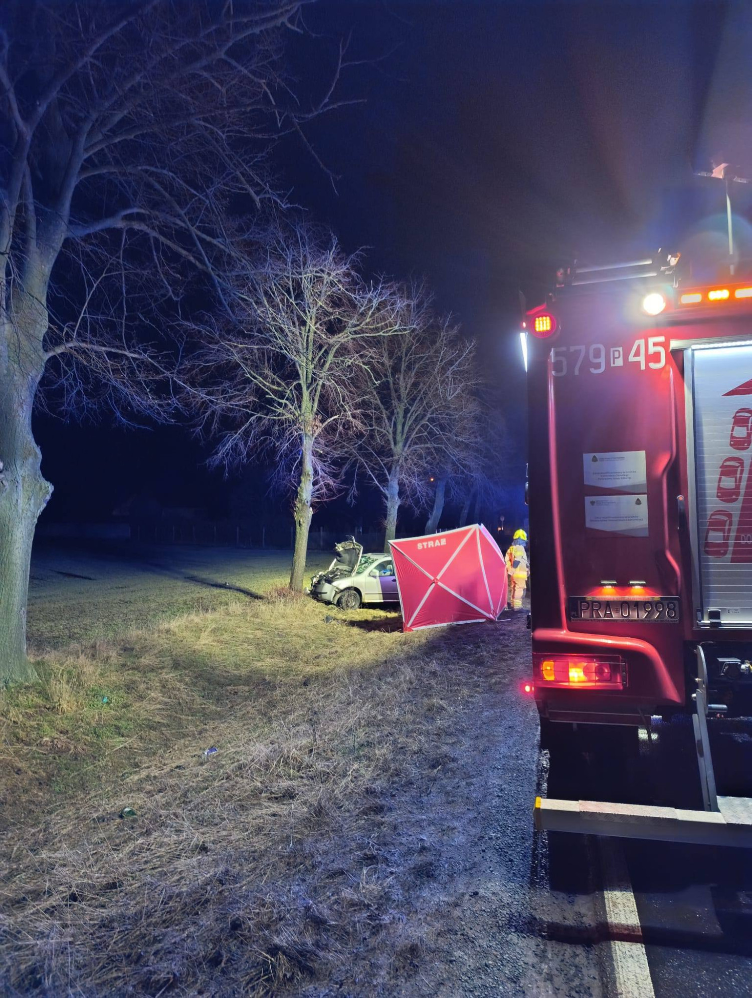 Do wypadku doszło o godz. 2.28 na drodze krajowej nr 36. Auto jadące od strony Dłoni w kierunku Rawicza zjechało z jezdni i z dużą siłą uderzyło w drzewo.