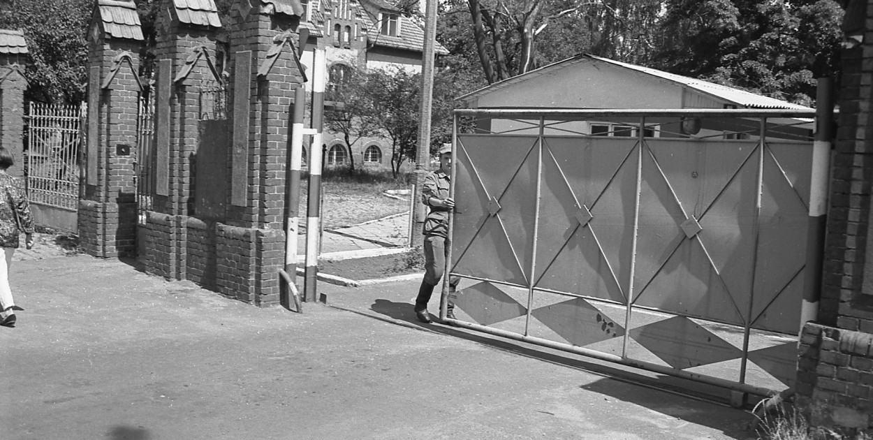 Zdjęcie główne. Żołnierz radziecka zamyka główną bramę koszar. Fot. Waldemar Śliwczyński