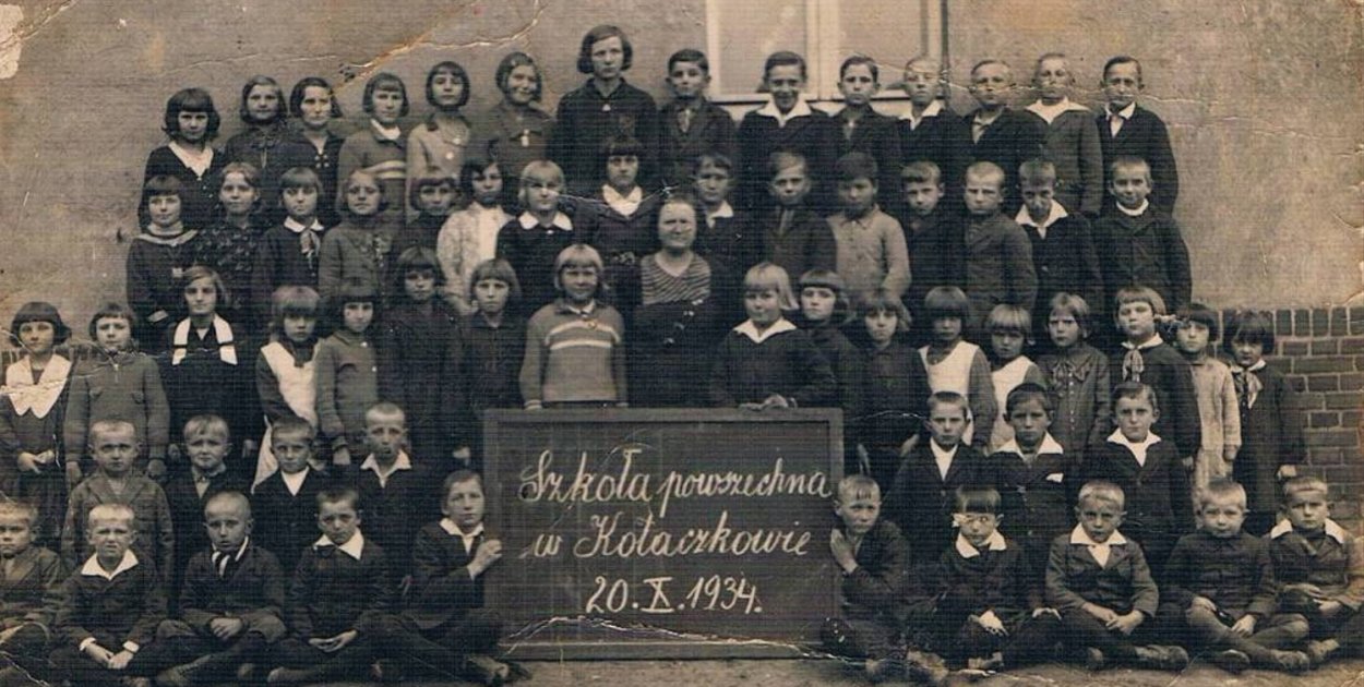 Zdjęcie główne: Szkoła Powszechna w Kołaczkowie w 1934 roku. W środku kierowniczka szkoły Stefania Gondelowa.