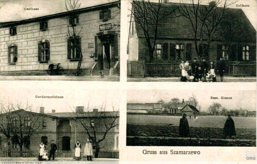 W środku: Pocztówka z Szamarzewa z 1910. Gospoda, urząd celny, posterunek żandarmerii i granica z widokiem na Samarzewo
