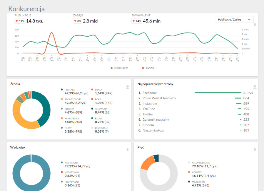 Monitorowanie konkurencji: Jeśli interesuje cię, co dzieje się wśród konkurencji, Newspoint pozwala monitorować działania innych firm i dostarcza cenne informacje na temat ich strategii. Pozwala też porównać działania komunikacyjne marki z działaniami konkurentów. Wszystko to zobaczysz na jednym, przejrzystym wykresie.