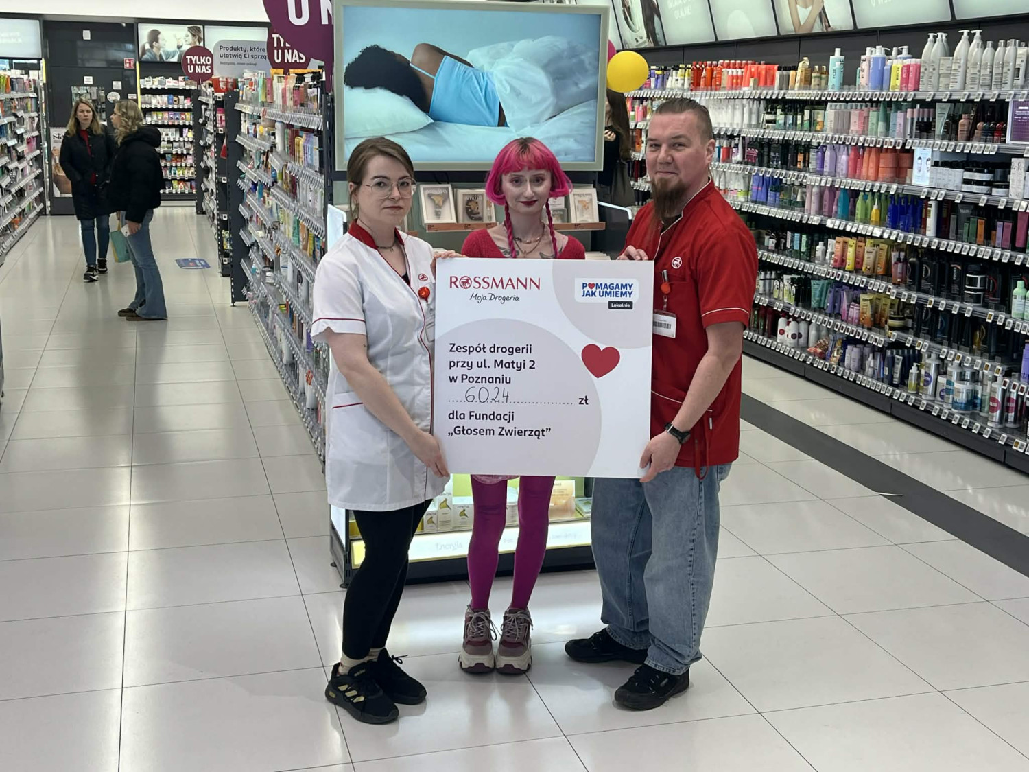Poznańska Fundacja „Głosem Zwierząt" od 2011 roku niesie pomoc bezdomnym zwierzętom. Zajmuje się ich leczeniem, socjalizacją i przystosowaniem do adopcji. Organizacja prowadzi własną kociarnię w Poznaniu oraz współpracuje ze schroniskami dla zwierząt bezdomnych w Dopiewie i Poznaniu. Od chwili powstania fundacja znalazła domy dla tysięcy podopiecznych. O wsparciu właśnie tej organizacji zdecydował zespół poznańskiej drogerii.