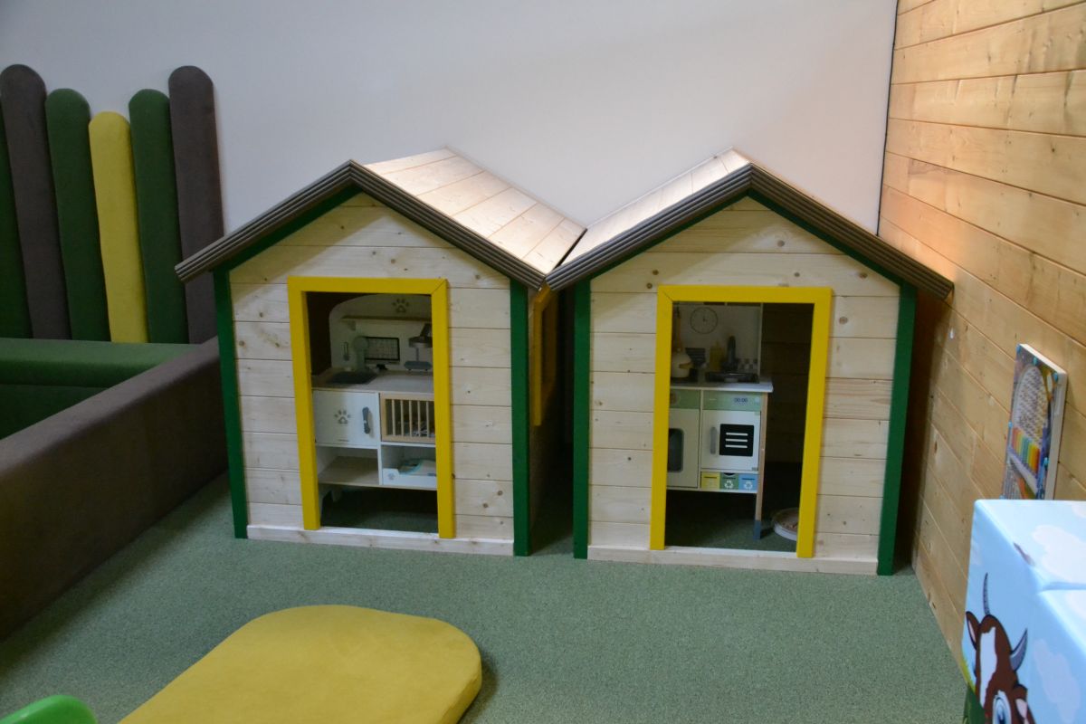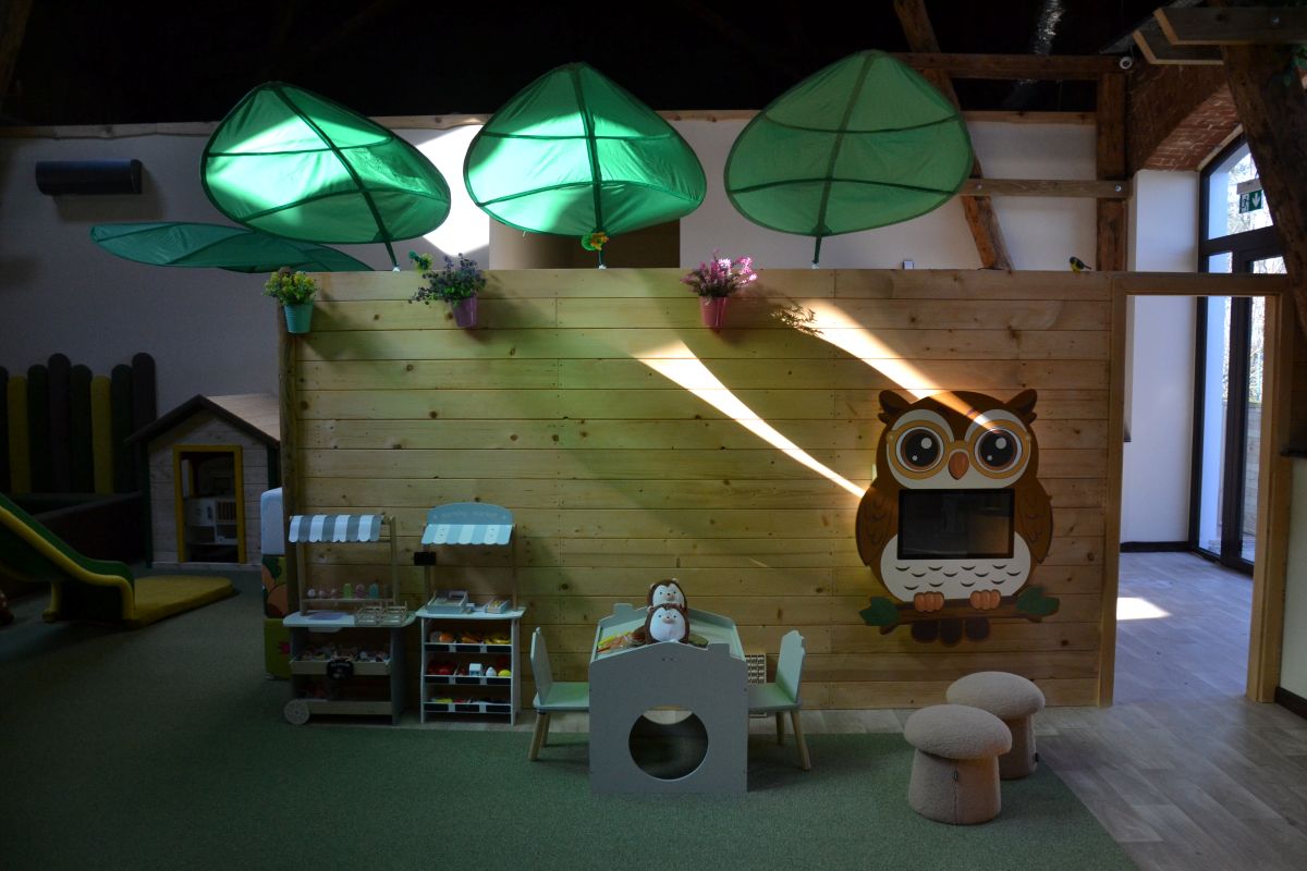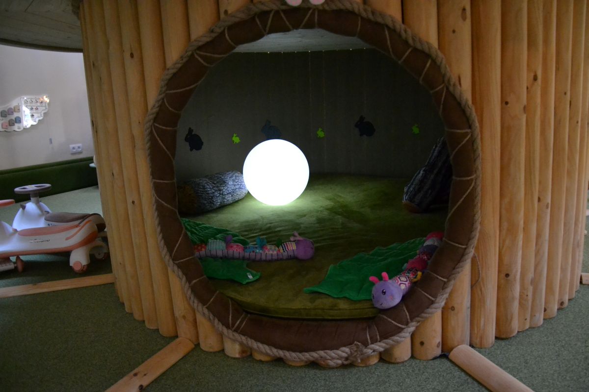 W środku czekają dwie główne strefy – duża konstrukcja dla starszych dzieci oraz spokojniejszy, sensoryczny „leśny zagajnik” dla młodszych. W tej drugiej strefie dzieci znajdą m.in. elementy światłoterapii, strefy wyciszenia i kreatywności oraz przestrzenie rozwijające zmysły.