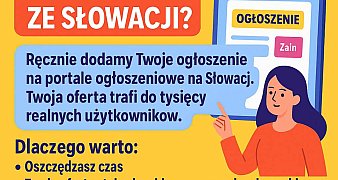 Promuj ogłoszenieChcesz dotrzeć do klientów ze Słowacji? Zajmiemy się tym za Ciebie. Jesteśmy firmą i wystawiamy faktury. Ręcznie dodamy Twoje ogłoszenie na ... czytaj więcej